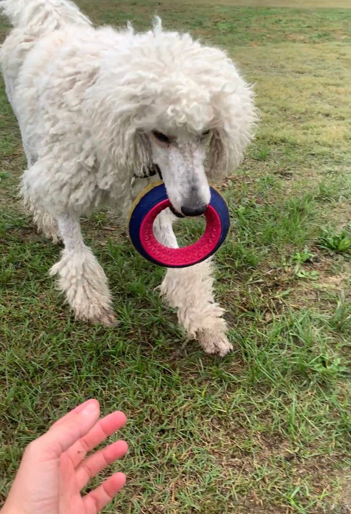 Andiamo dal cane e gli indichiamo con la mano la direzione del gioco e dico “cerca + nome del gioco”